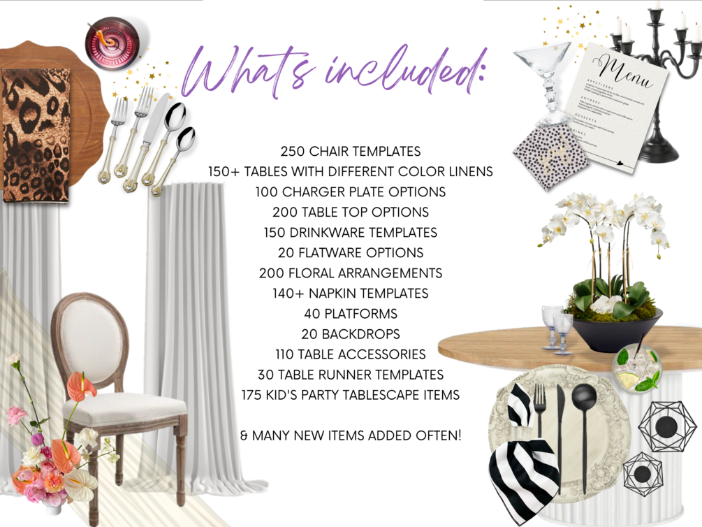 ☑️ Over 3000 Templates, including Chair Templates, Kid's Party Tablescape Items, Table Styles with Different Color Linens, Charger Plate Options, Table Top Options, Drinkware Templates, Flatware Options, Floral Arrangements, Napkin Templates, Platforms, Backdrops, Table Accessories & Table Runners